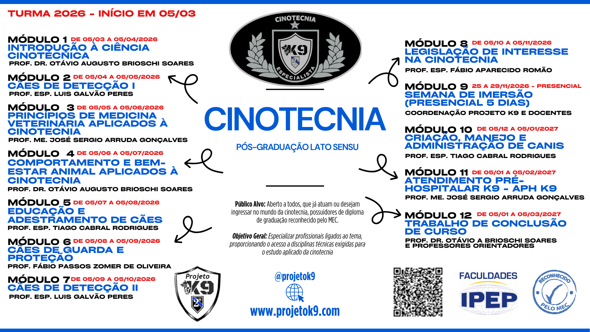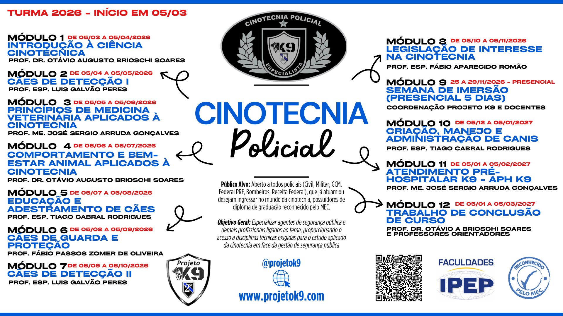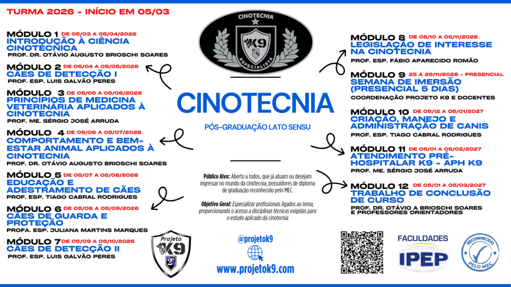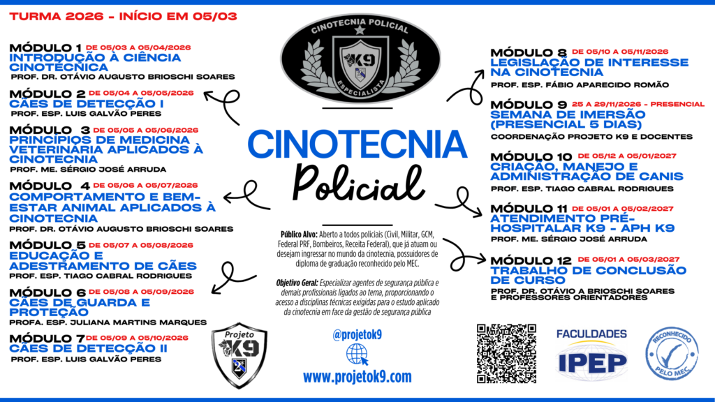 Público Alvo: Aberto a todos policiais (Civil, Militar, GCM, Federal PRF, Bombeiros, Receita Federal), que já atuam ou desejam ingressar no mundo da cinotecnia, possuidores de diploma de graduação reconhecido pelo MEC.